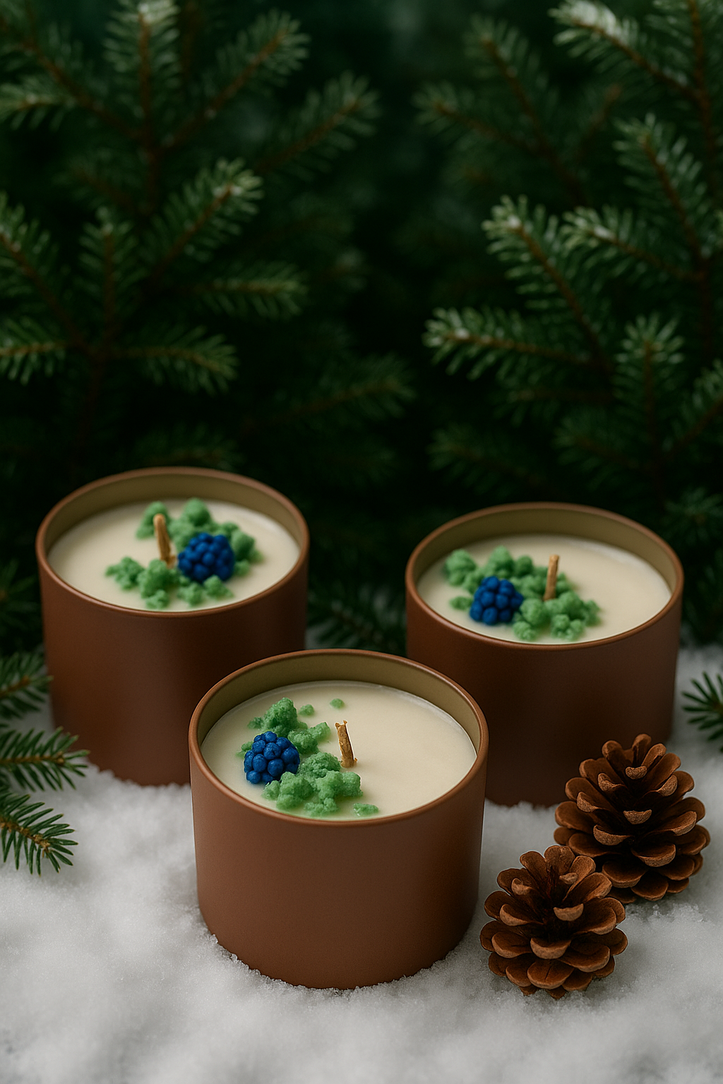 A cool, fresh winter forest blend — blue spruce, eucalyptus, and spearmint wrapped in cypress, bayberry, moss, and rich fir. Grounded with cedarwood, patchouli, and soft incense for an elevated evergreen glow.