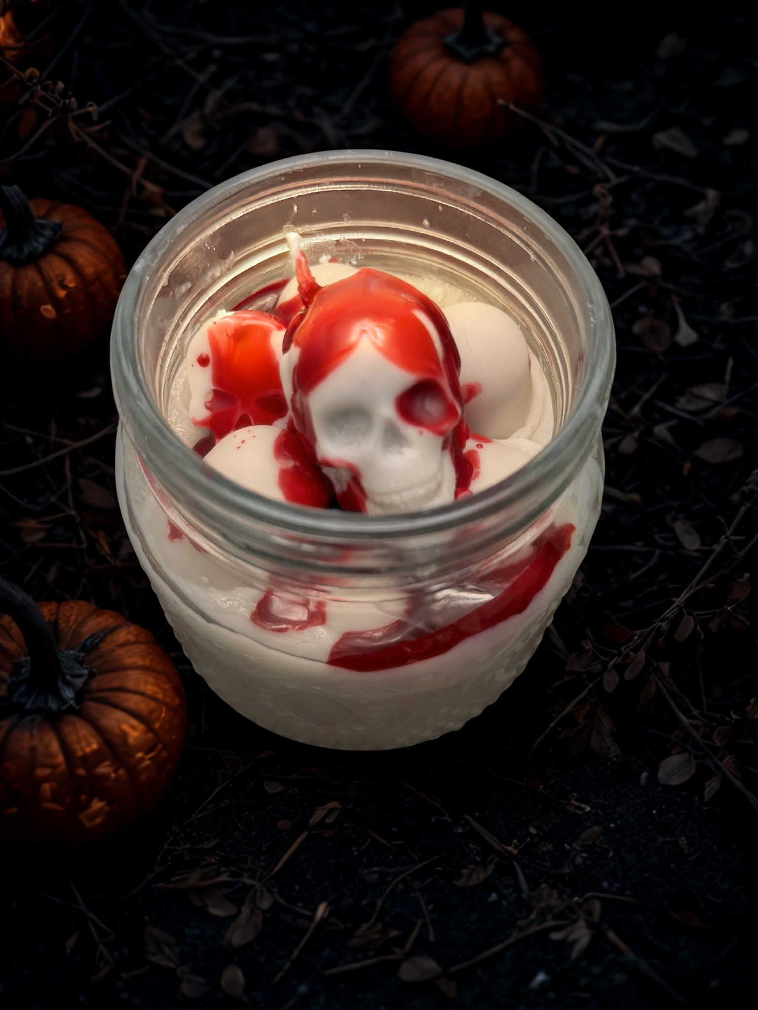 The perfect candle for all those late Autumn nights outside, we refuse to be bothered by the bugs. This candle is infused with Citronella, Lemongrass, Pear and Thyme essential oils and topped with creepy skulls covered "Blood" with fresh lemongrass and rosemary herbs.