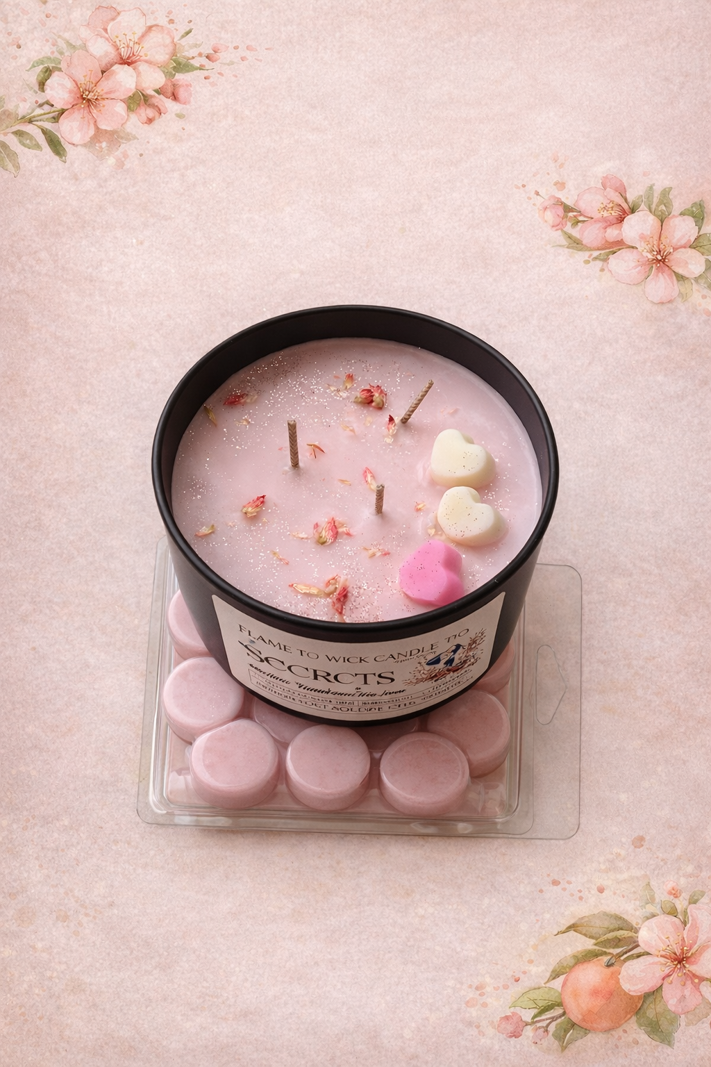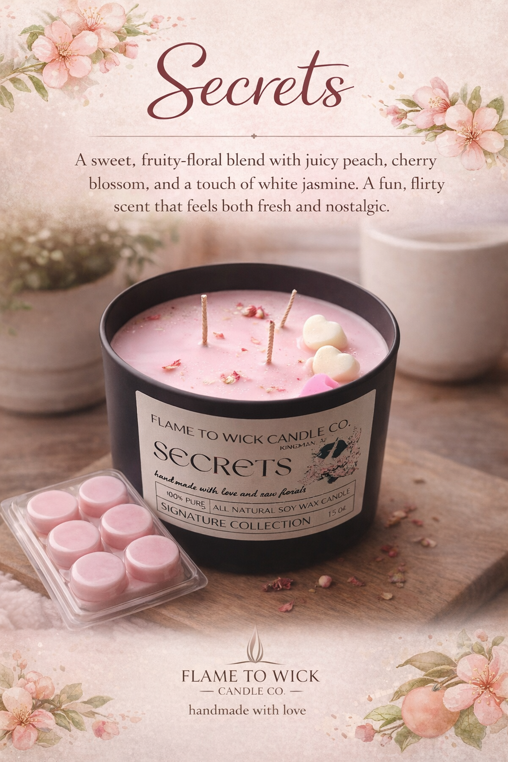 Secrets is a sweet, fruity-floral blend with juicy peach, cherry blossom, and a touch of white jasmine. A fun, flirty scent that feels both fresh and nostalgic.